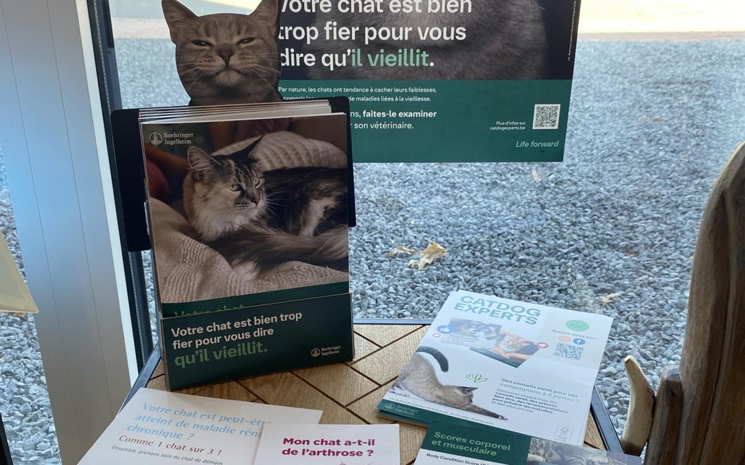 Vous trouverez du coté « chat » de la salle d’attente, des livrets expliquant les différentes atteintes du chat âgé ainsi que des signes pour reconnaître l’inconfort et d’autres explications très complètes sur cette période gériatrique et les directives idéales à prendre pour le bien-être de votre animal.